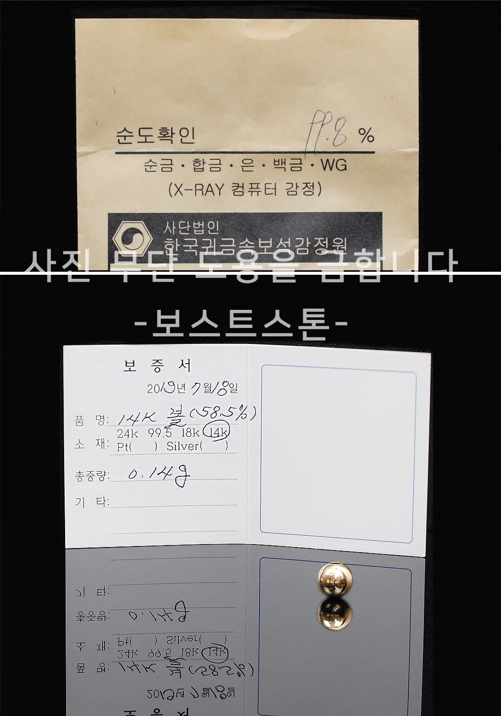 한국 귀금속 보석감정원에서 감정을 받은 순금제품입니다.